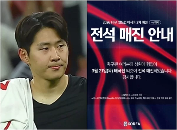 14일, 대한민국 축구 국가대표팀은 공식 인스타그램을 통해 오는 21일 서울월드컵경기장에서 열리는 2026년 북중미 월드컵 2차예선 태국전 티켓이 전석 매진되었다고 발표했습니다.